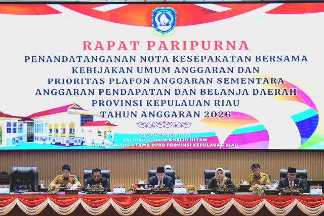 TANJUNGPINANG – Pemerintah Provinsi Kepulauan Riau bersama DPRD Kepri resmi menyepakati Kebijakan Umum Anggaran (KUA) dan Prioritas Plafon Anggaran Sementara (PPAS) Tahun Anggaran 2026. Kesepakatan tersebut ditandai dengan penandatanganan Nota Kesepakatan Bersama dalam Rapat Paripurna yang digelar di Ruang Sidang Utama Balairung Raja Khalid Hitam, Dompak, Senin (24/11).